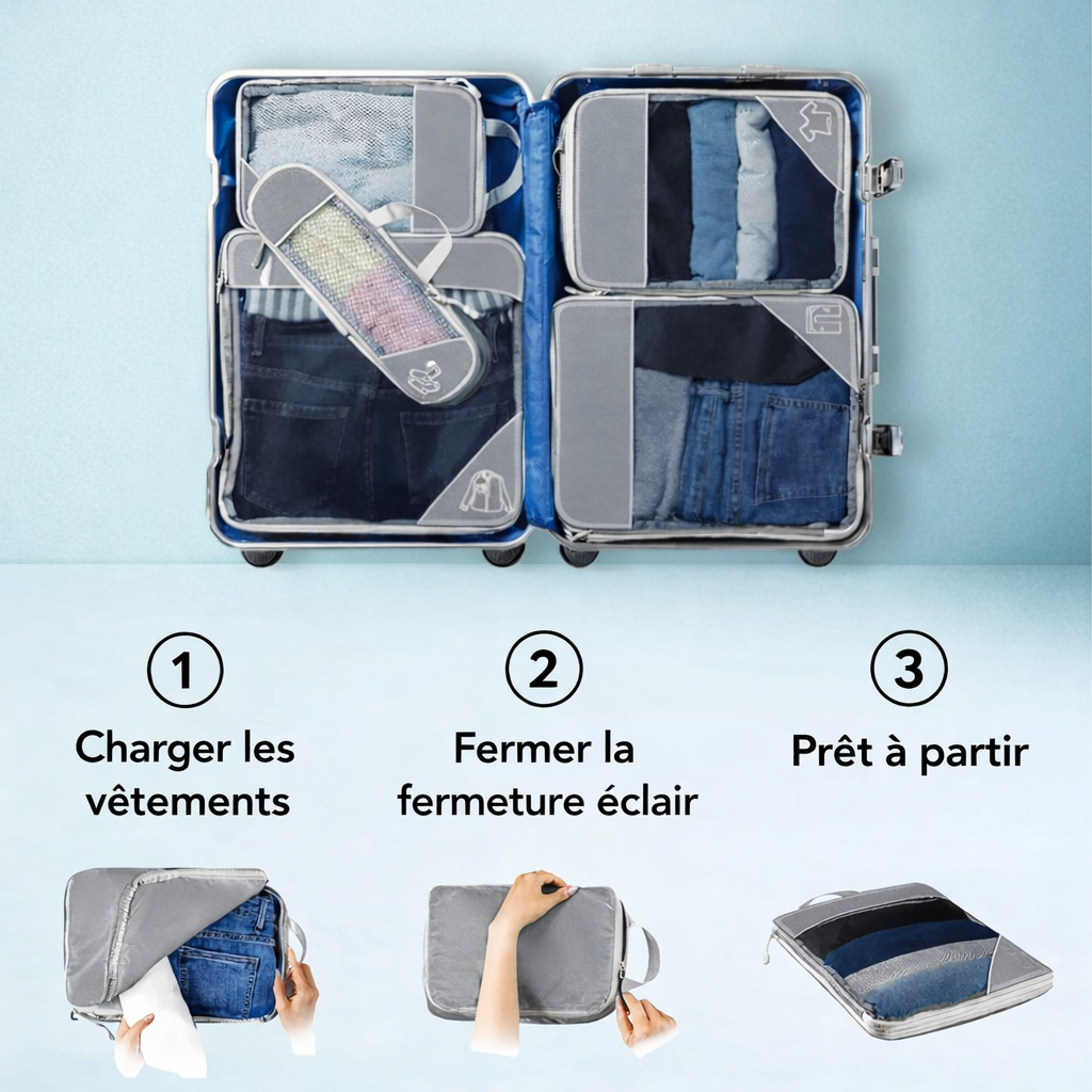 Oui, chaque set est conçu pour s’adapter à toutes les tailles de valises et sacs de voyage. Les pochettes sont flexibles et modulables.